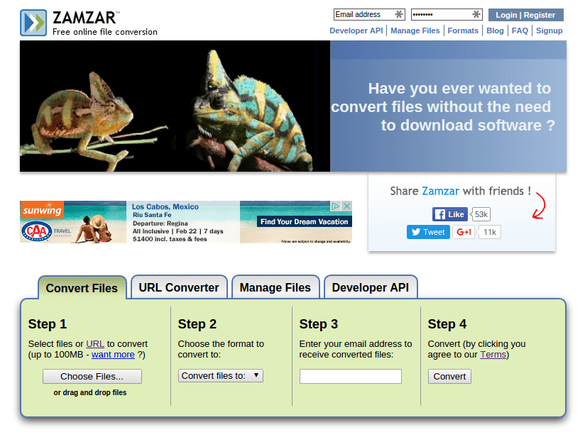 Zamzar The Zamzar experience is almost the same as CloudConvert but with one big difference. You cannot do a free conversion without giving your email address. This can be annoying if you just want to do a small document.