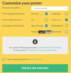 The second service I found was Posterizer. Similar to Block Posters lets you upload an image and then select the settings to create either a PDF file or a group of JPG images. Posterizer is 100% free however so there is no need to worry about a logo watermark. The one thing I disliked about Posterizer is the fact that it might crop the printed version. It has a nice preview that gives you an idea of what is being cropped so you can get in idea if something you think is important that will be cut out. It is perhaps best suited to printing posters of images but if the infographic is the right size you might not have any issues.