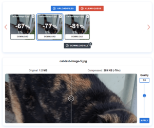The Optimizilla interface is familier, you can drag and drop your image onto the page or select them. Once you add images though the interface is a little different than TinyJPG and some of the others. Because you can select the compression for each image you upload so you can upload multiple images, select them and apply different qualities for each. For my test I was able to upload the same image three times and then select the quality for each. Here is a screenshot of what I mean.