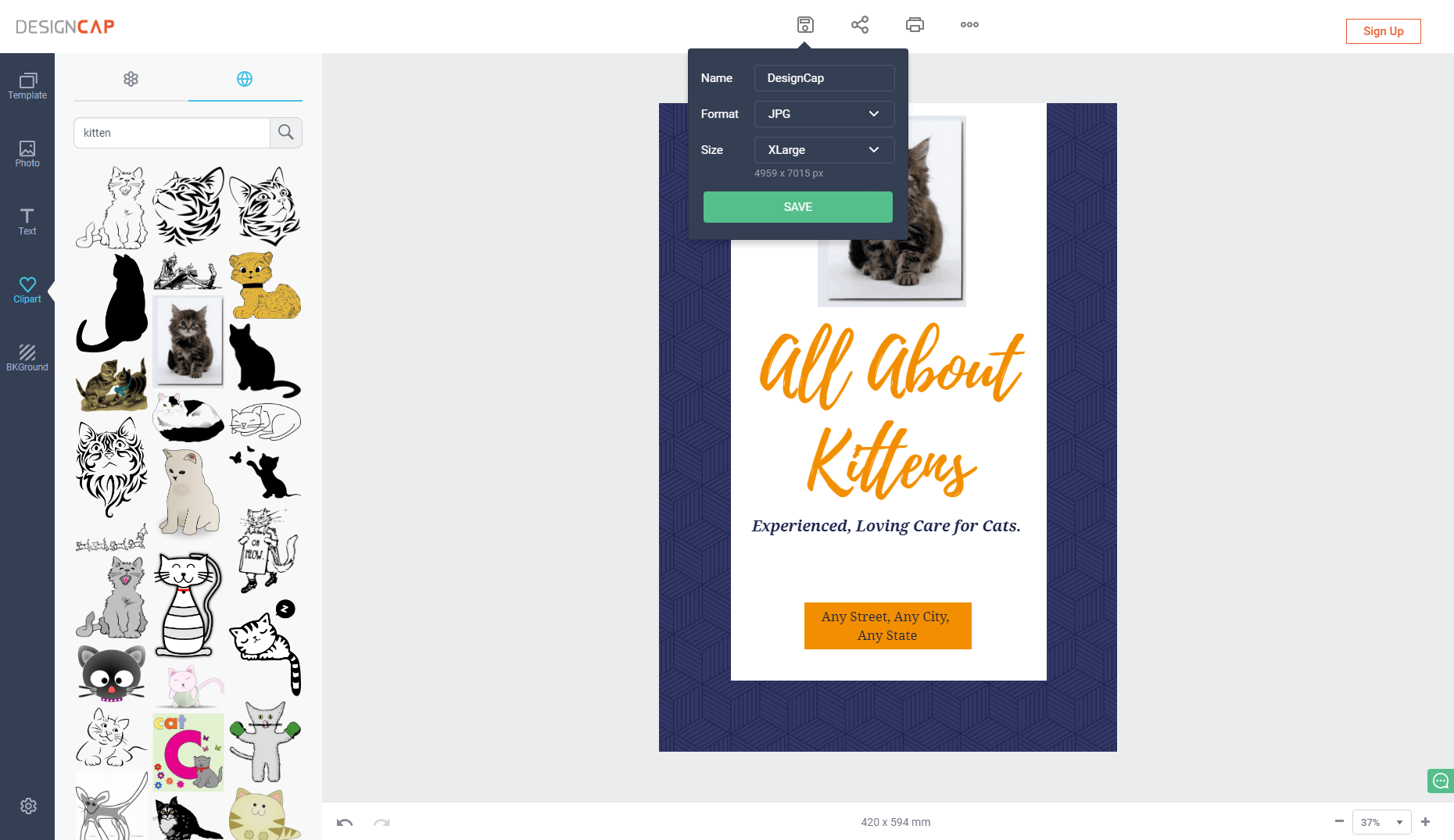 When you are all done creating your poster you can download it as a jpg and print it. You can also save your poster as you go and load it again later if you like but it does require you to download a file and upload it again.