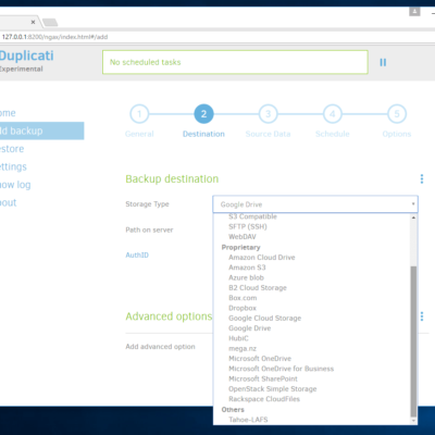 The second thing I really like about Duplicati is the number of options you have to store your backup files. There are the usual cloud storage services like Google Drive, Amazon S3 and Dropbox, but there is also the newer, and cheaper, Backblaze B2. Perhaps even more less known for holding backups like mega and Hubic. I counted 22 options for cloud storage using Duplicati. Below is the list.