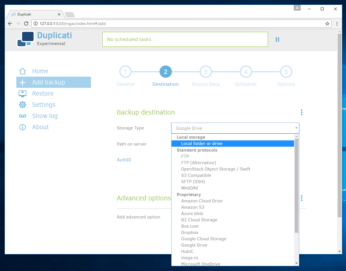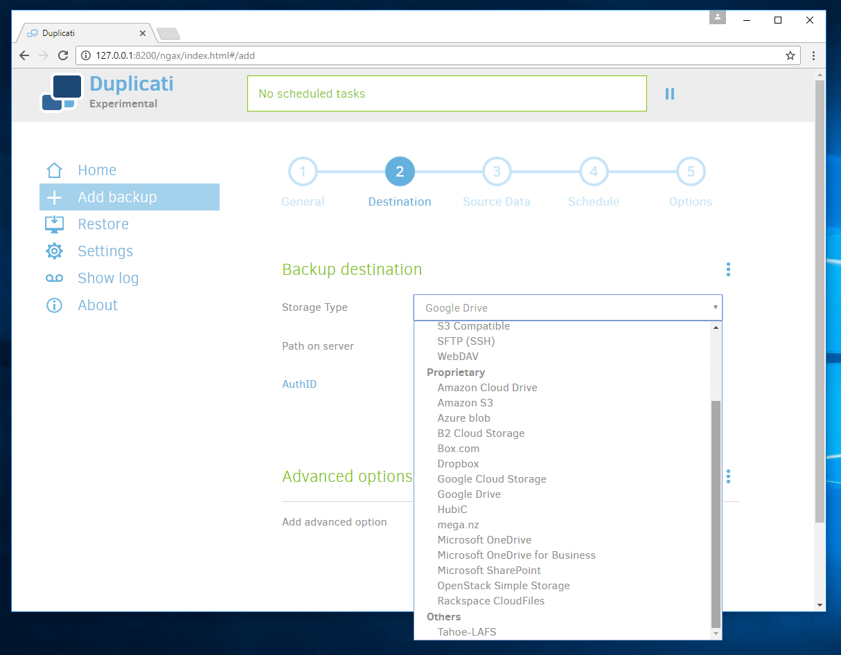The second thing I really like about Duplicati is the number of options you have to store your backup files. There are the usual cloud storage services like Google Drive, Amazon S3 and Dropbox, but there is also the newer, and cheaper, Backblaze B2. Perhaps even more less known for holding backups like mega and Hubic. I counted 22 options for cloud storage using Duplicati. Below is the list.