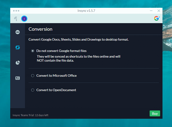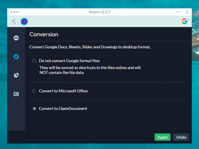 Syncing documents created with Google Drive, like word processing documents, spreadsheets and presentations, to your desktop is pretty much a pointless task. There is no way to open those documents on your desktop unless you convert them to a desktop format, either into an Microsoft Office format, or into an OpenDocument format. If you have a constant Internet connection that is reliable you might not need to worry about this, but having local copies of your documents in a format that is easy to edit on desktop applications is really helpful. The Insync client can do this for you by automatically converting documents from Google Drive format to either Microsoft Office formats or OpenDocument formats. Another good reason to enable document conversion using Insync is to be able to create a backup of your files to either your local backup or your cloud based backup, or preferably both since you never know what what happen. Then if your Google Account gets locked for some reason you still have access to all your documents. This one feature alone is worth the price of buying Insync.