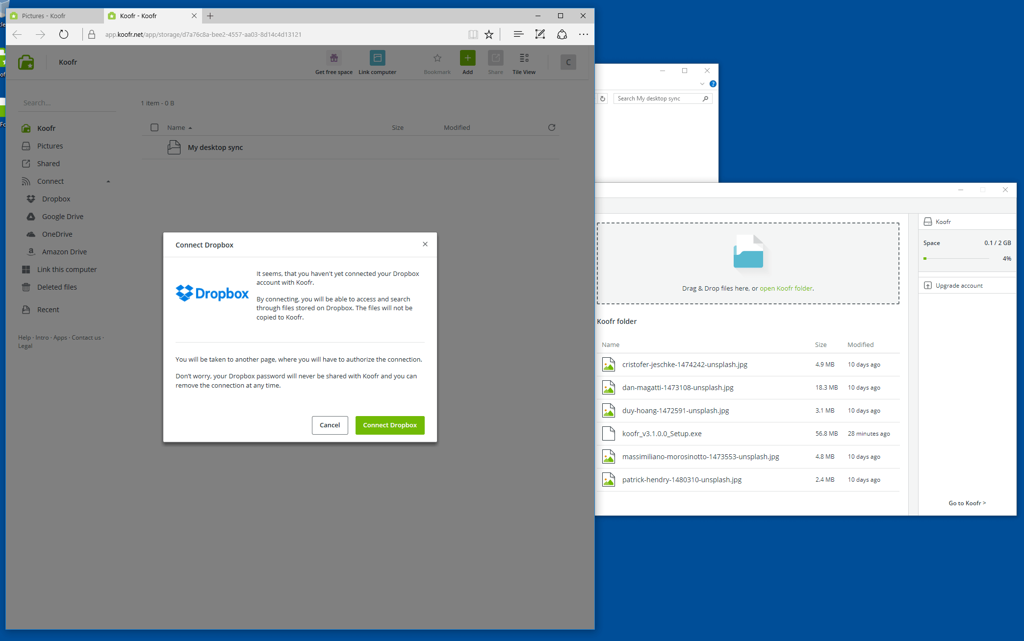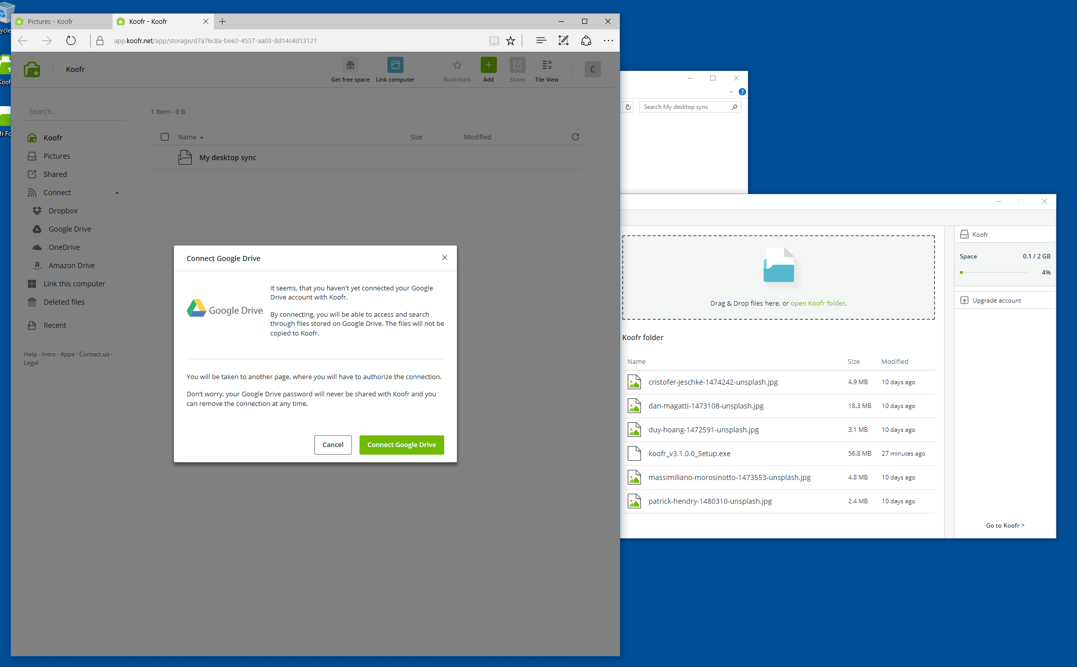 You can also connect your other cloud storage services (Google Drive, Dropbox, OneDrive and Amazon Drive) to Koofr. Doing so allows you to search and access those files. Koofr is trying to tie together your cloud storage life and if you have files on those other cloud storage services you might find this feature useful.